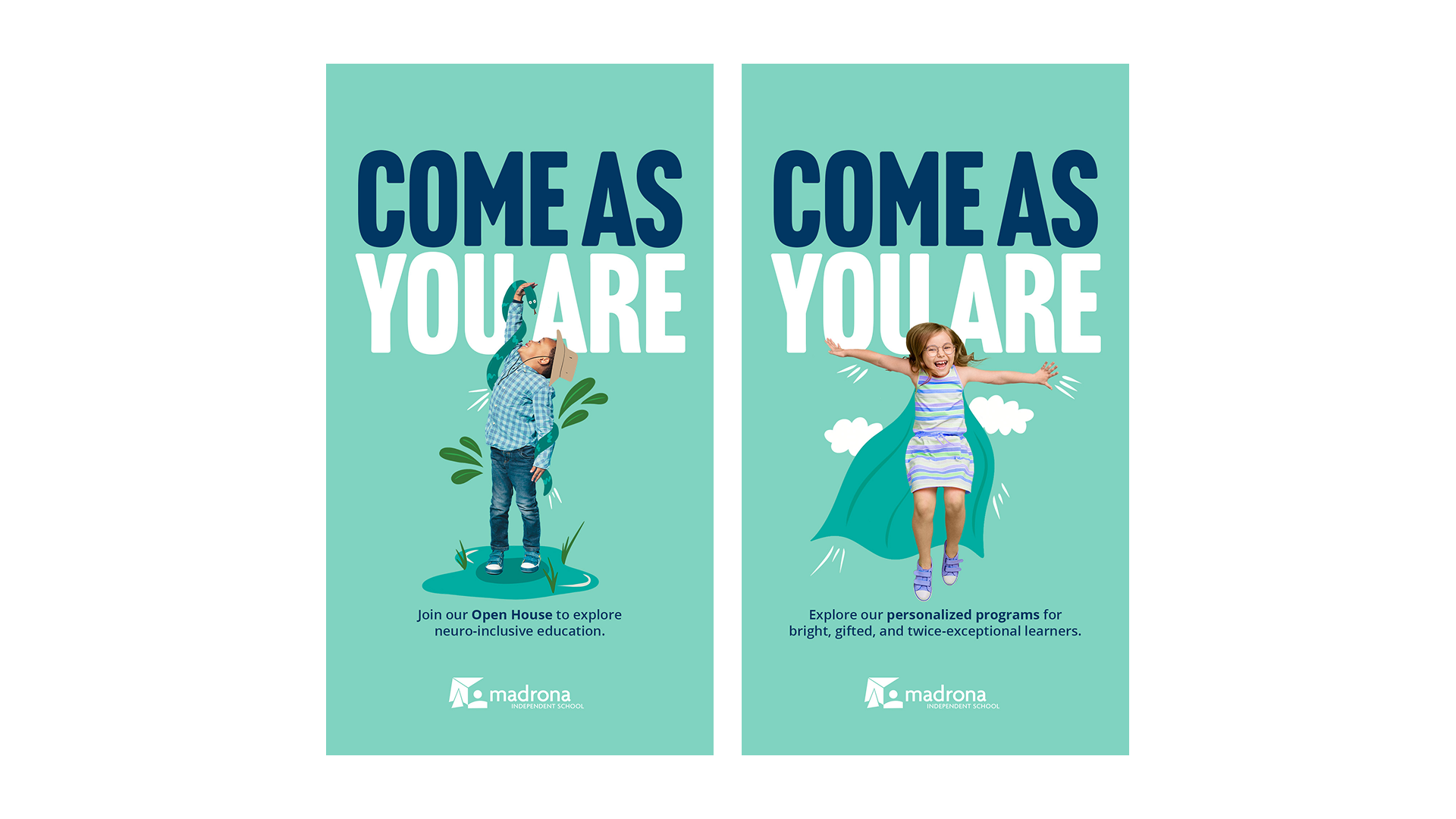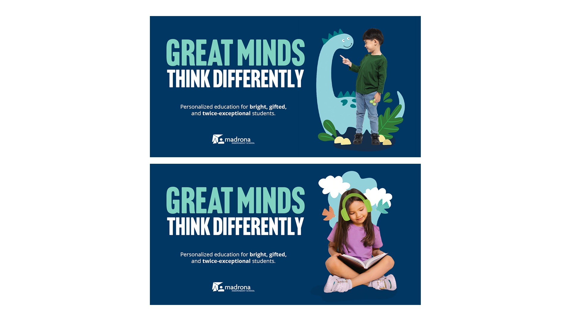 Our concept – GREAT MINDS THINK DIFFERENTLY – is designed to show how gifted children don’t need to conform to fit in at Madrona. Their uniqueness is welcomed, encouraged, and affirmed. This concept celebrates each student’s individuality and highlights Madrona’s philosophy that differences are strengths – and that community is built through curiosity, creativity, and shared respect for one another’s unique minds.